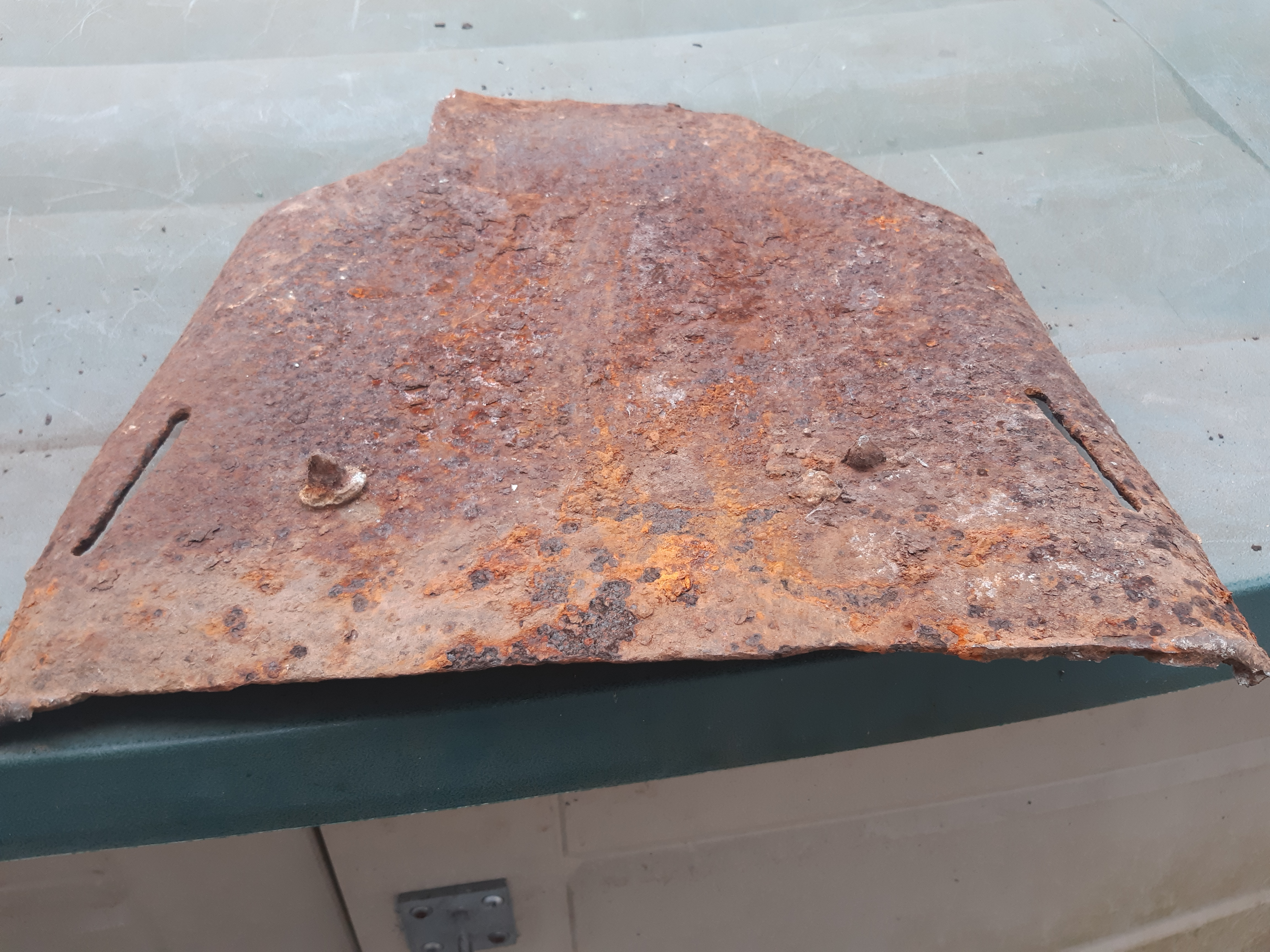 Once I got it safely home, I photographed it from several angles and set about the task of trying to positively identify it. To that end, I emailed the Museum of aviation at Robins Air Force Base in America, as they are currently in the process of restoring a B17 to its former glory. Their Curator, a former US Air Force officer by the name of Arthur Sullivan, replied to my enquiry with 24 hours, expressing a great interest in the the plate and the story behind it. Despite casting their expert eyes over the photos I sent them, we are still not 100% certain; but it would seem likely, given its curved edges and obvious mounting bolts underneath, that it is seat base armour from either of the Pilot’s seats; the two angled slots most likely to have been for the lap straps to pass through.