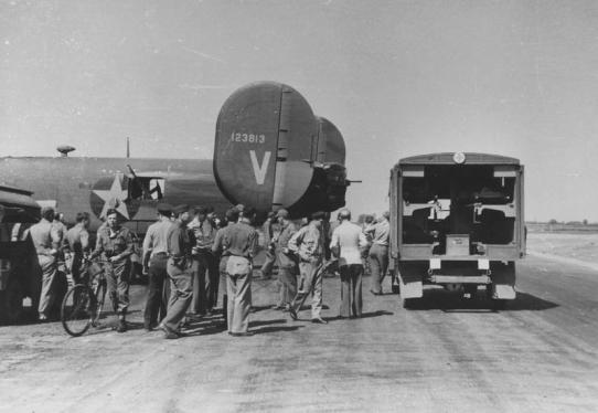 A medical truck and ground personnel standby as B-24 Liberator #41-23813 “Victory Ship” returns from a mission. (IWM FRE 640)