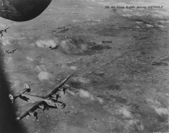 Liberators, including a B-24 (#41-29153), ‘Greenwich’ of the 506th BS, 44th BG (pilot 1st Lt. Robert Marx) conducts a raid on a German airfield near Diepholz. February 21st 1944. This aircraft was subsequently lost on April 8th 1944, all the crew were taken prisoner. (Official U.S. Air Force Photo)