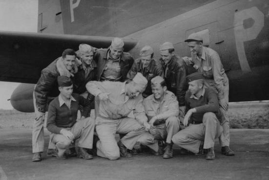 Robert H. Wolff’s crew. L to R Back Row: Ira Bardman, Alfred Clark, William ‘Casey’ Casebolt, James Brady, Arthur ‘Eagle’ Eggleston, Willis ‘Browny’ Brown . Front Row: Charles ‘Stu’ Stuart, Fredric ‘Buzz’ White, (aiming at the enemy) Bob Wolff, Lawrence ‘Mac’ McDonell. The photo was taken after Regensburg for publicity purposes. (@IWM FRE 905)