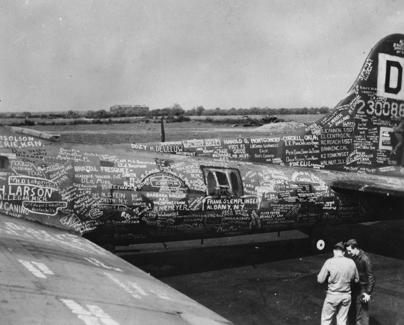After completing 50 missions, “Squawkin’ Hawk II” was covered with autographs before being sent back to the US for retirement and eventual scrapping.(@IWM FRE 4124)