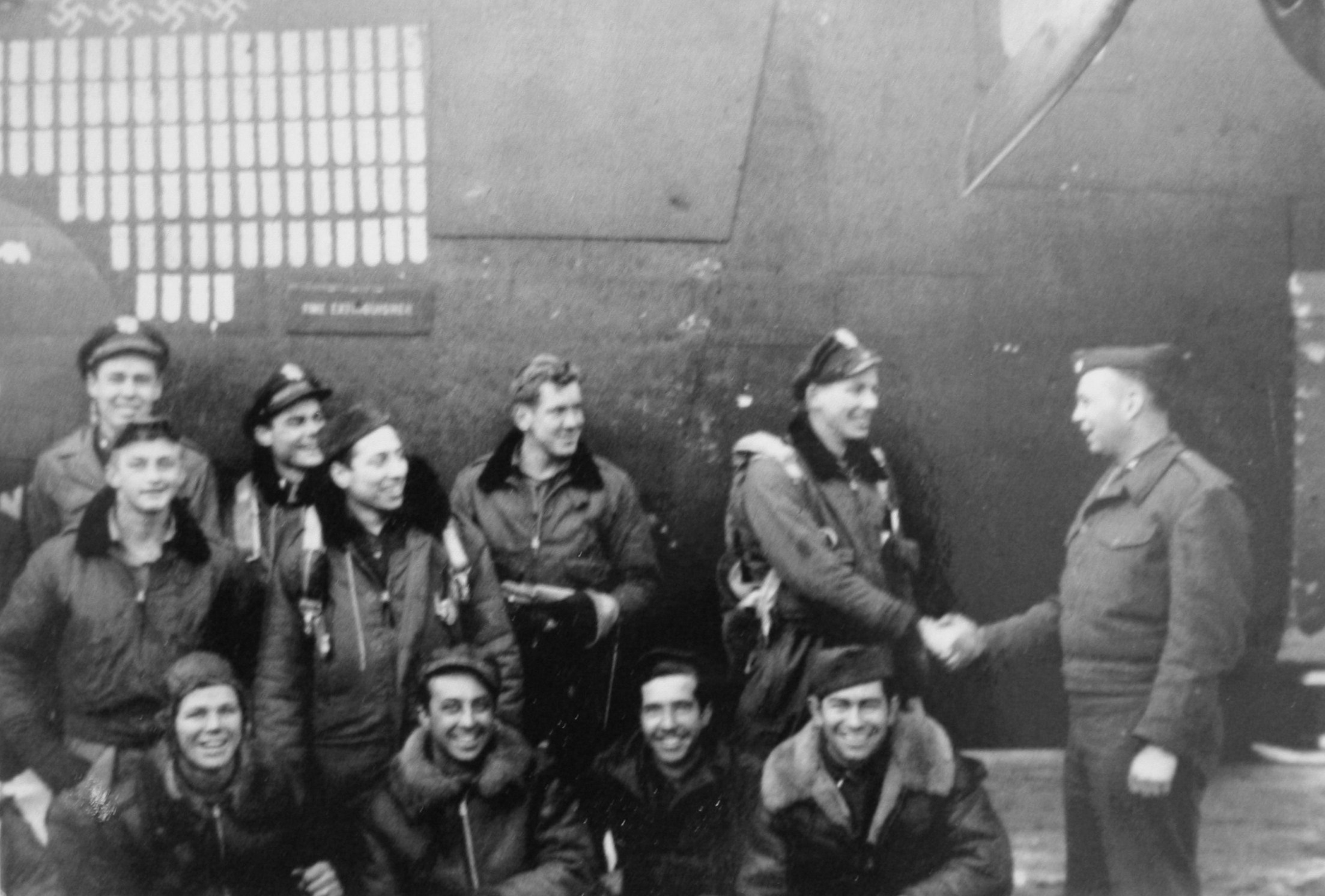 “Chuck” Walker & his crew being congratulated by Lt. Col. Fleming, (deputy commander) on completion of their 35th mission and “Bunnie’s” 100th.(IWM UPL 13142)