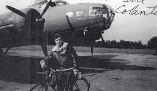 Bill Colantoni poses in front of B-17 #41-9085 ‘Jarrin’ Jenny’ at Polebrook, the first B-17 to arrive in the UK. (IWM UPL 6830)