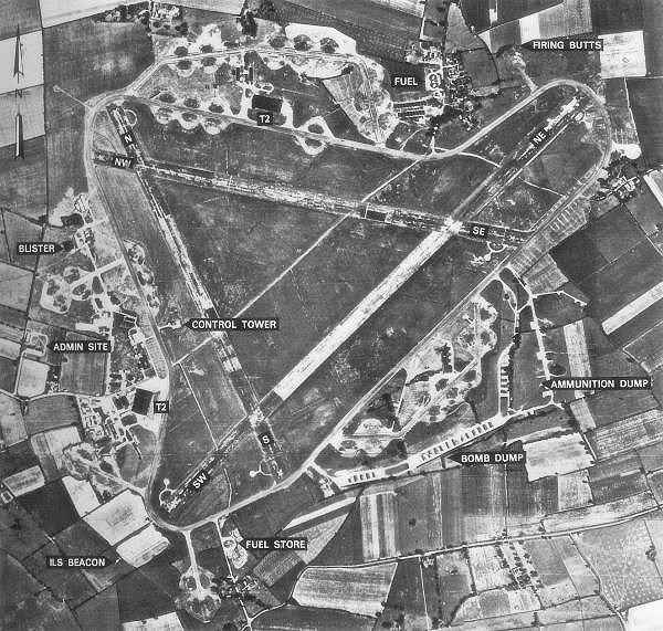 Deopham Green (Station 142) was built-in 1943, to Class A standard and consisted of the usual three concrete runways; the main of 2,000 yds running NE-SW and two further runways NW-SE and W-E both of 1,400 yds. All three were linked by a perimeter track with fifty-one dispersed hardstands (forty-nine loops and two pans), and two T2 hangars, one to the north and the second to the south-west of the airfield. The accommodation sites, 13 in all, lay to the west and south-west and could accommodate around 2,900 personnel. A mix of communal sites, sick quarters and accommodation blocks were spread widely to avoid injury through attack. The bomb site and fuel stores were situated to the south-east well away from the accommodation area.