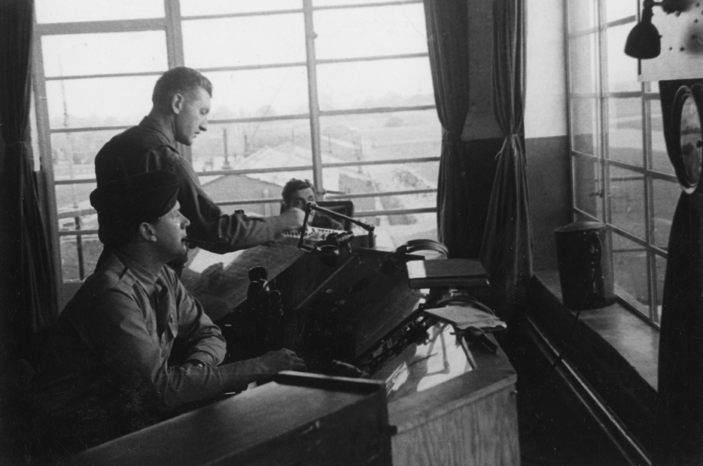 Men of the 355th Fighter Group survey the airfield from inside Steeple Morden Control Tower (@IWM FRE441).