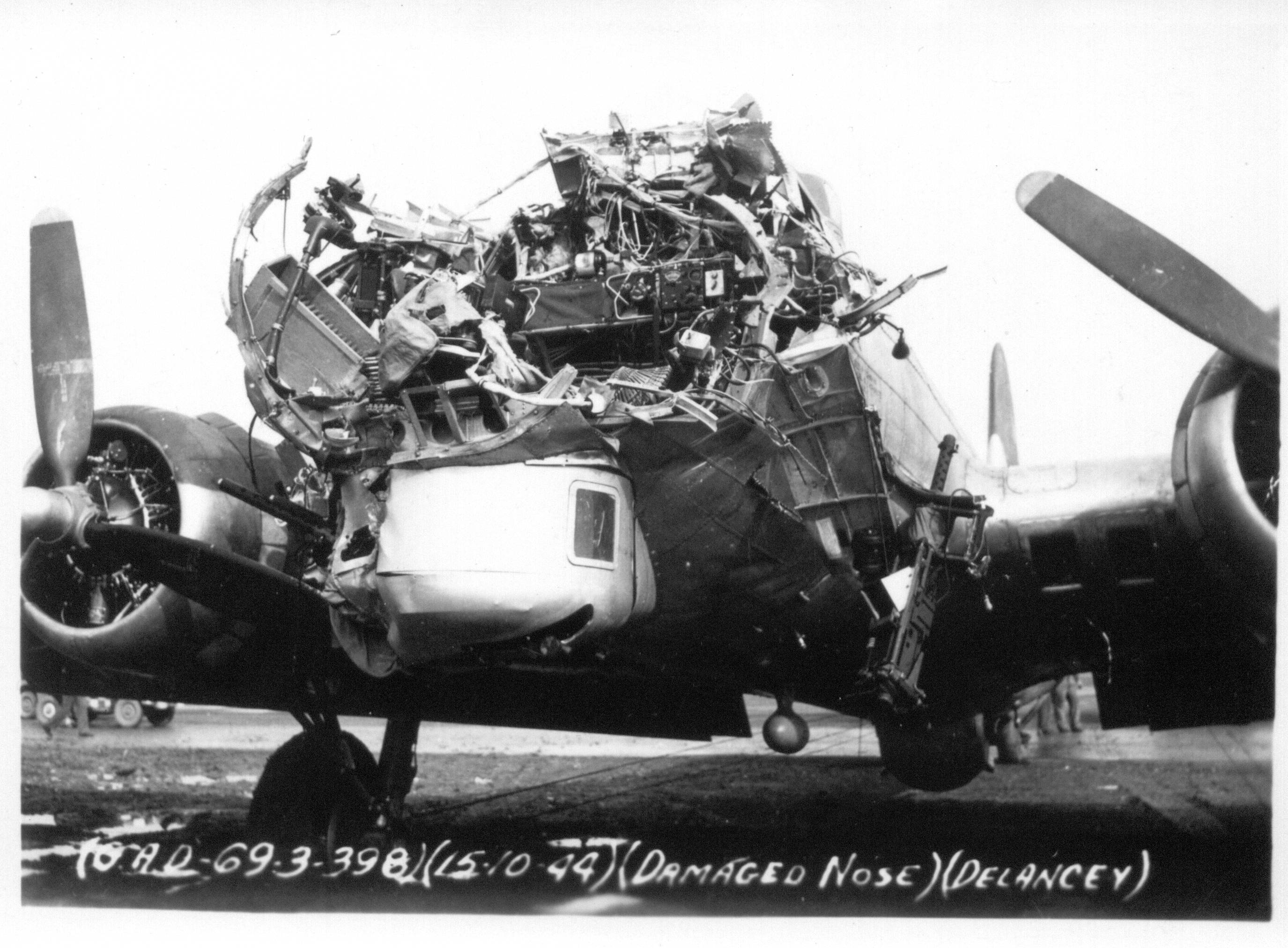 October 15th brought the true realities of war to the Group when a flak shell hit B-17G #43-38172 in the nose exploding inside the aircraft. The Toggler/bombardier, Sgt George Abbott, was killed outright, and the instruments were all but obliterated. With no oxygen and the nose barely recognisable, the pilot 1st Lt. Lawrence DeLancey, managed to bring the B-17 home thus saving the lives of the other crewmen on board.