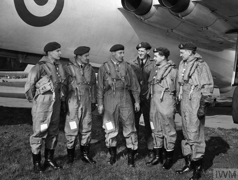 Vickers Valiant bomber crews of No. 49 Squadron RAF about to leave RAF Wittering for Christmas Island in the Pacific to take part in Britain’s nuclear tests, March 1957. © IWM (C(AM) 2466)