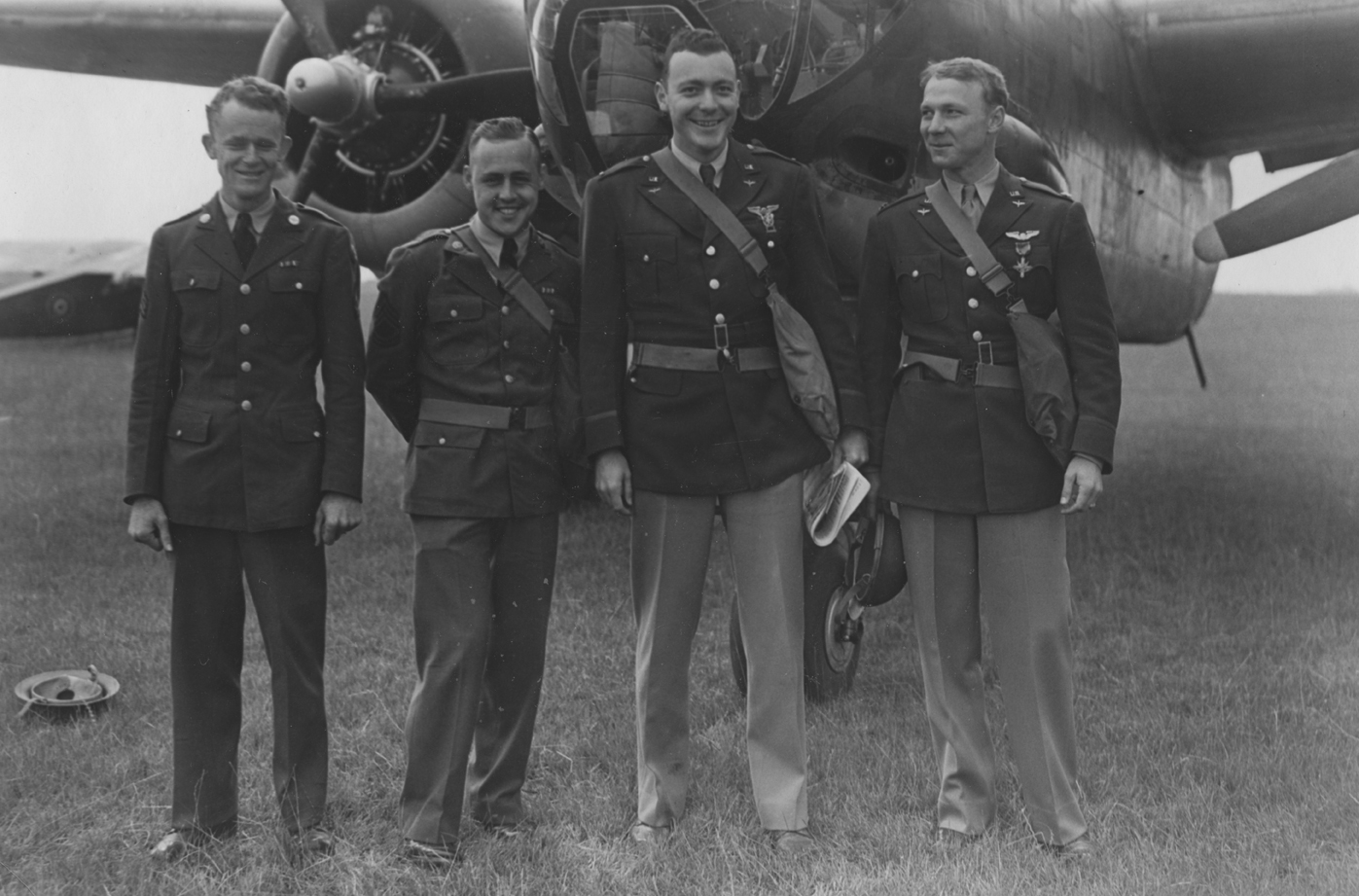 Sergeant Bennie Cunningham, Technical-Sergeant Robert Golay, Major Charles C Kegelman and Lieutenant Randall Dorton in front of a Boston bomber. (@IWM FRE 914)