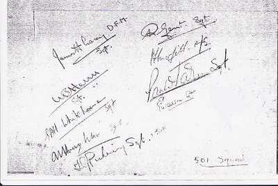 Piece of paper from the Sergeants Mess at RAF Gravesend in 1940, bearing the signatures of some of the Sergeant Pilots of 501 Squadron. Clearly legible is that of James “Ginger” Lacey DFM, who became the top-scoring RAF Battle of Britain pilot, and Geoffrey Pearson, (last one down, right hand column) who was killed in combat, aged just twenty-one. Via Kent County Library Services.