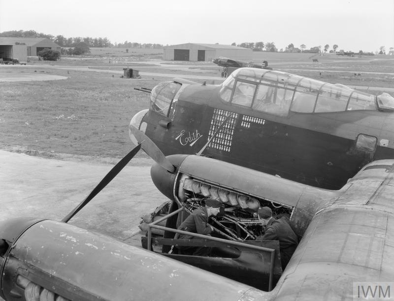 Mechanics at work on an engine of Lancaster B Mk. III, (LM577) ‘HA-Q’ “Edith”, of No. 218 Squadron. On March 19th 1945, this aircraft was hit by flak over Gelsenkirchen damaging the rear turret and injuring the gunner’s eye. LM577 went on to complete more flying hours than any other Lancaster on the station. (@ IWM CH 15460)