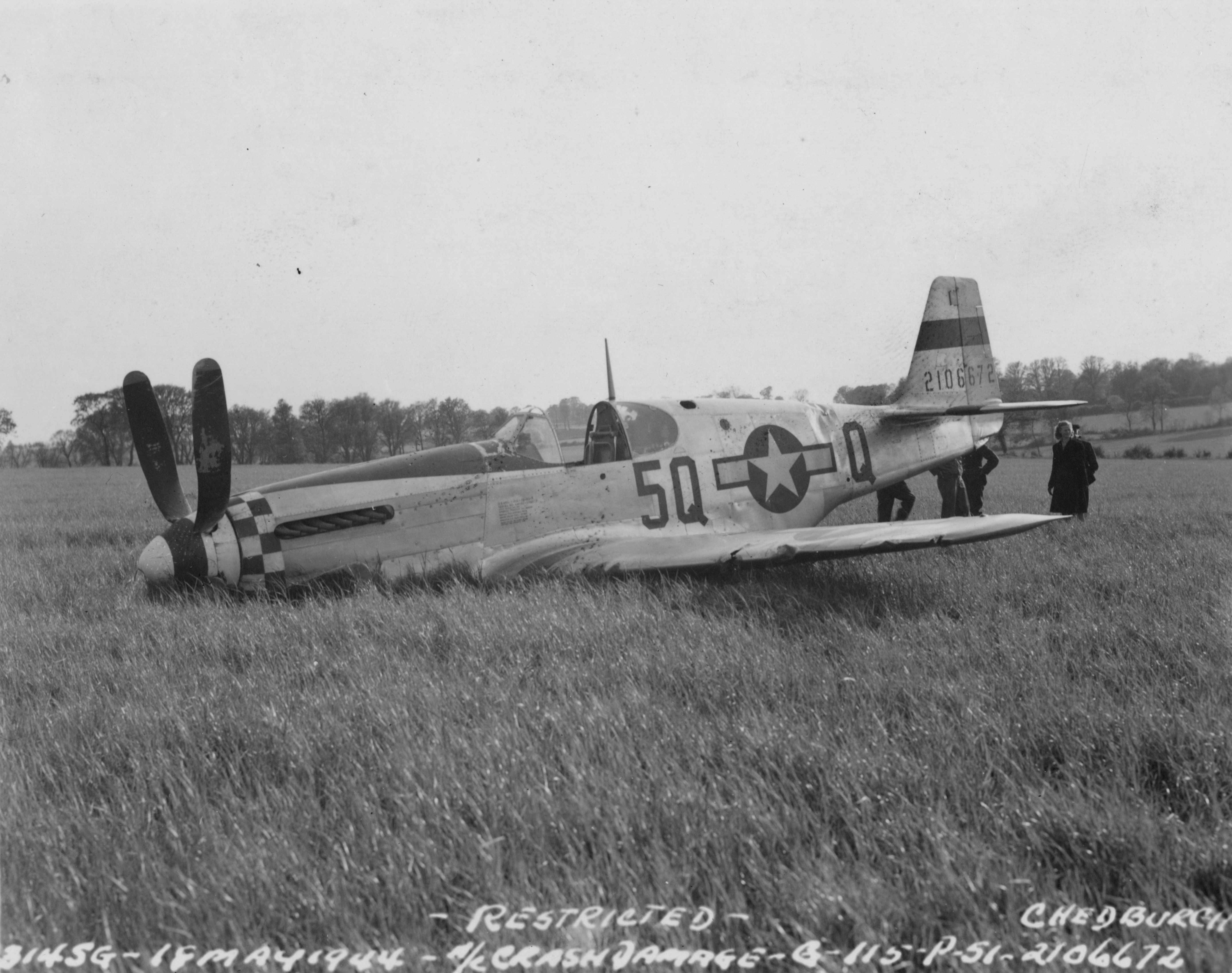 A P-51 Mustang (5Q-Q, serial number 42-106672) of the 504th Fighter Squadron, 339th Fighter Group, that has crash landed at Chedburgh, 18 May 1944. (IWM FRE 2784)