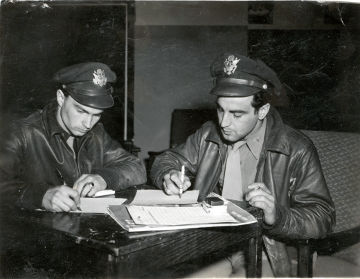 After Kassel, Sept. 27, 1944: Lt. William Beyer (left), and Lt. Bocquin (right) prepare their reports. While Bocquin downed three enemy planes, Beyer got five– becoming an “Ace in a Day.” .(IWM UPL 29364)