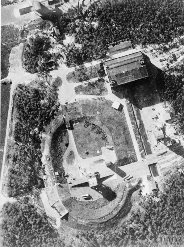 Enlargement of part of a vertical photographic-reconnaissance aerial taken by Flt. Sgt. Peek, of Test Stand VII at the Research Centre Peenemunde. At the bottom centre of the elliptical earthwork is a V2 rocket on its trailer. Two other trailers are to the right. Also note light AA positions on top of the pre-launch assembly hall at upper right. (@IWM (C 4782))