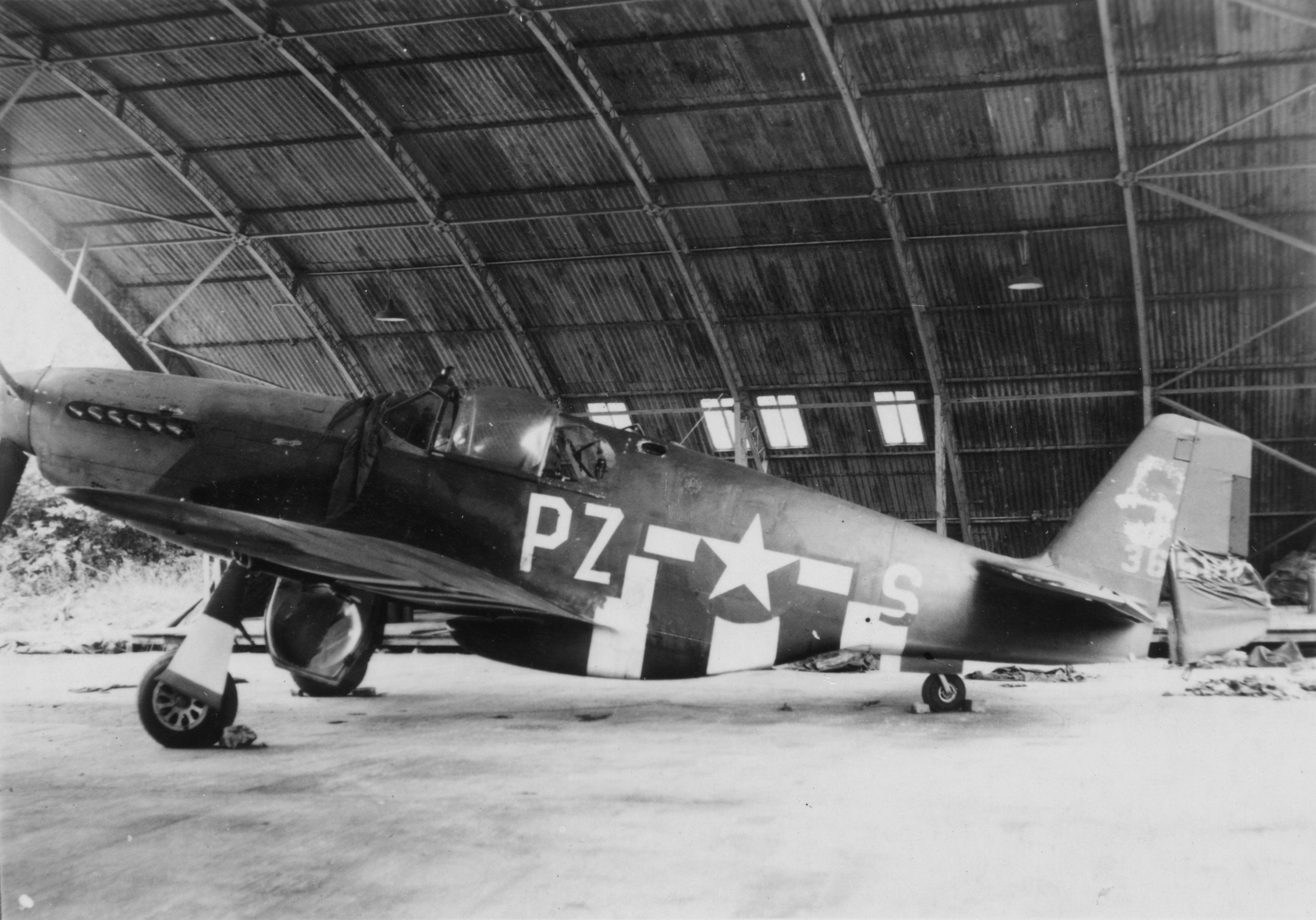 A battled damaged P-51 Mustang (PZ-S) of the 486th FS, in a Blister hangar at Bodney. (IWM- FRE 2803)