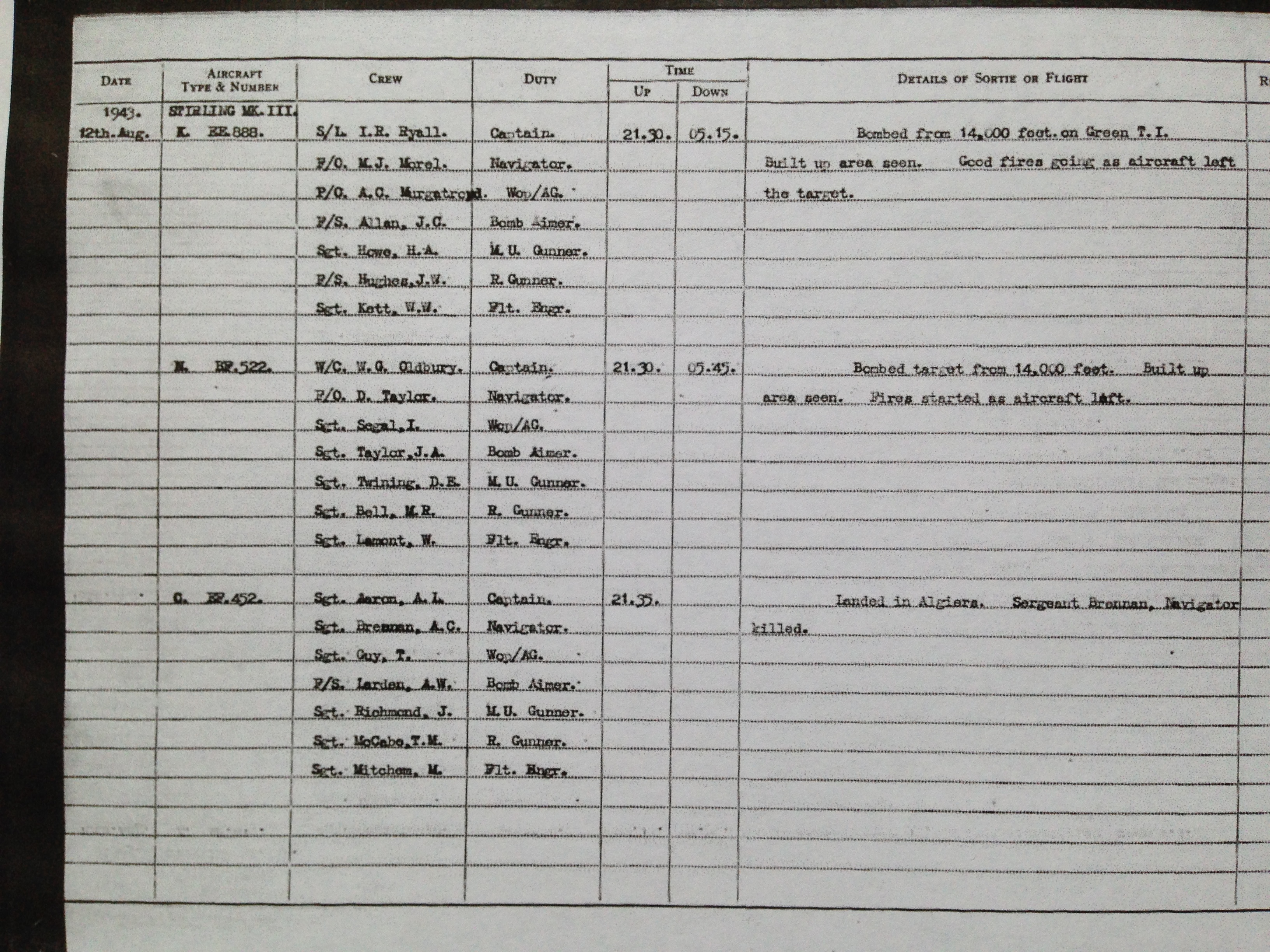 The entry in the Operations Record Book for August 12th 1943, merely states “Landed in Algiers, Sergeant Brennan, Navigator Killed.”*2