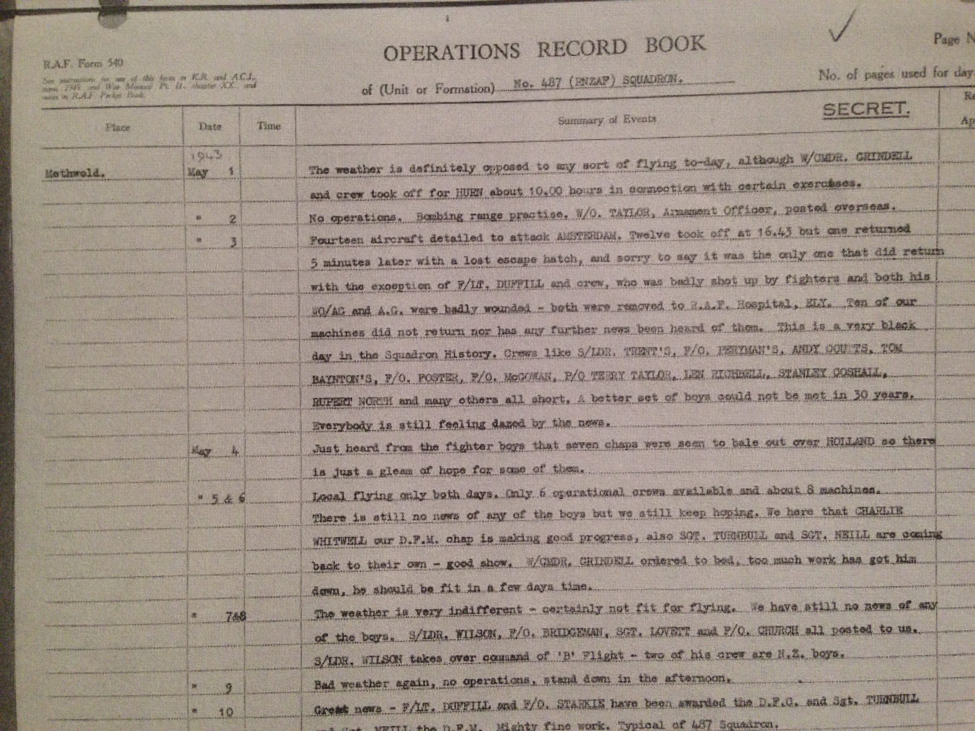 In 1942 he returned to operational duties as a newly promoted Squadron Leader taking command of B Flight, 487 (NZ) Squadron at RAF Feltwell. At the time 487 were part of No. 2 Group and were in the process of replacing their Blenheims with Venturas. The squadron moved from Feltwell to Methwold in early April 1943. Little did they know that only a month later, the Squadron’s Operations Record Book would read: “This is a very black day in the Squadron history…a better set of boys could not be met in 30 years. Everybody is still feeling dazed by the news.”